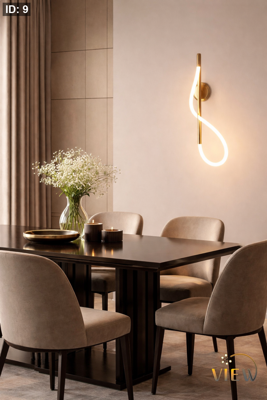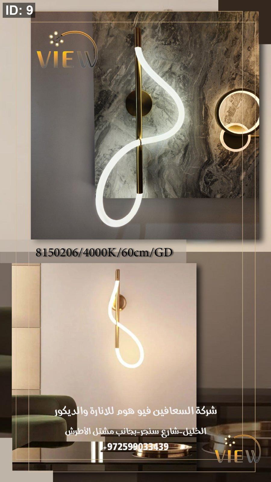إنارة جدارية بتصميم انسيابي عصري، تمنح المكان لمسة فنية وضوءًا ناعمًا يضفي دفئًا وأناقة.