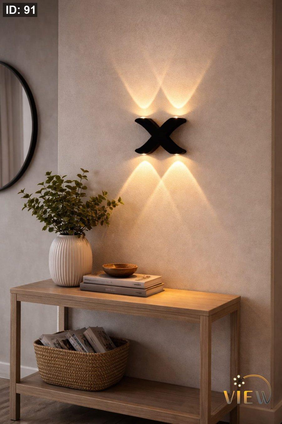 إنارة جدارية مودرن بتصميم هندسي على شكل X، تبعث الضوء للأعلى والأسفل بأسلوب متناغم يصنع تأثيرات ضوئية جذابة على الجدار.
