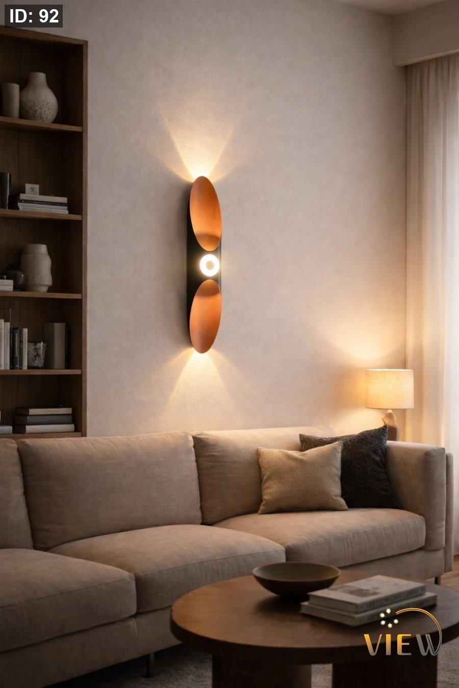 إنارة جدارية مودرن بتصميم طولي أنيق يجمع بين الإضاءة العلوية والسفلية مع نقطة ضوء مركزية، لتمنح الجدار عمقاً بصرياً وإضاءة دافئة هادئة. تصميمها المتوازن يجعلها قطعة ديكور تضيف فخامة دون مبالغة.